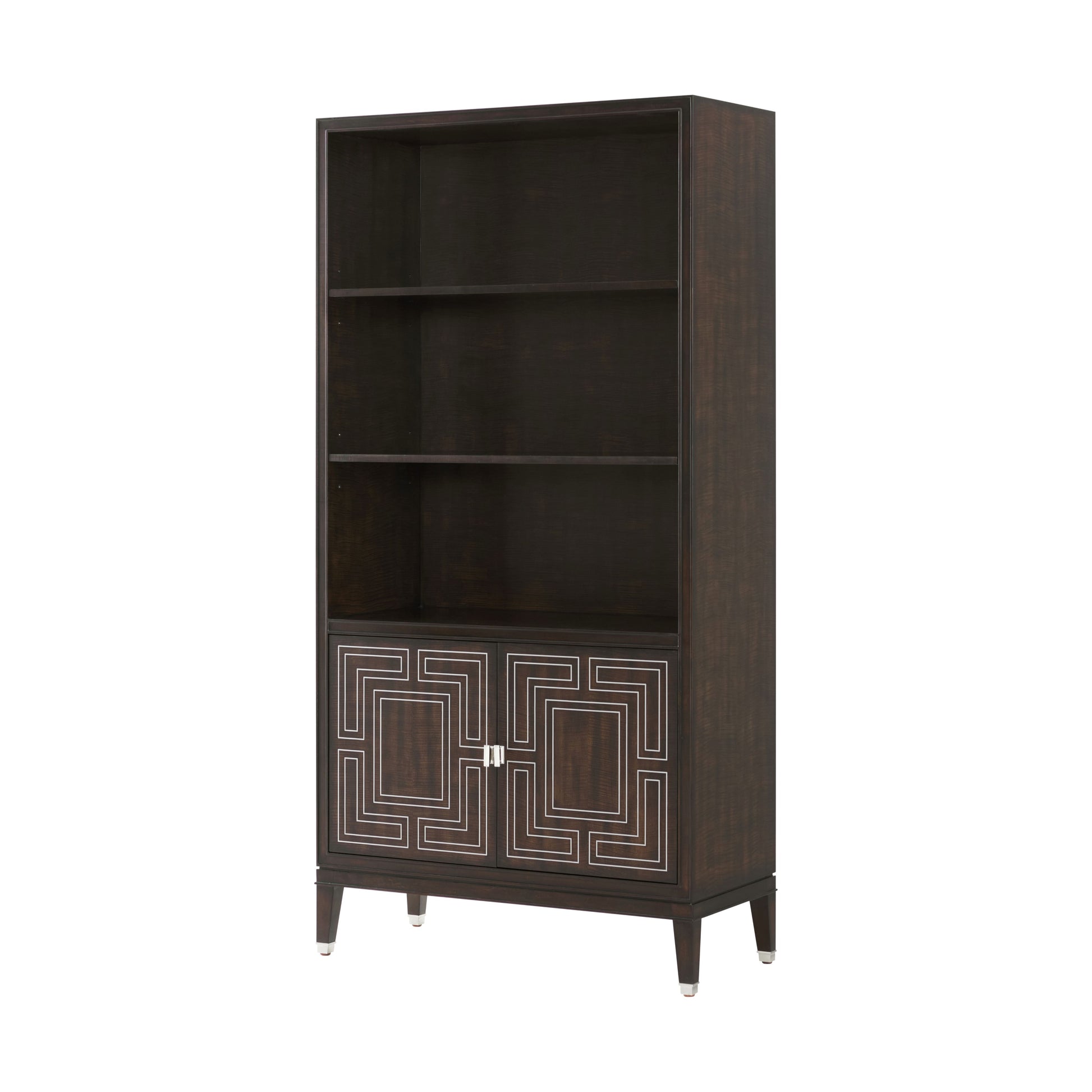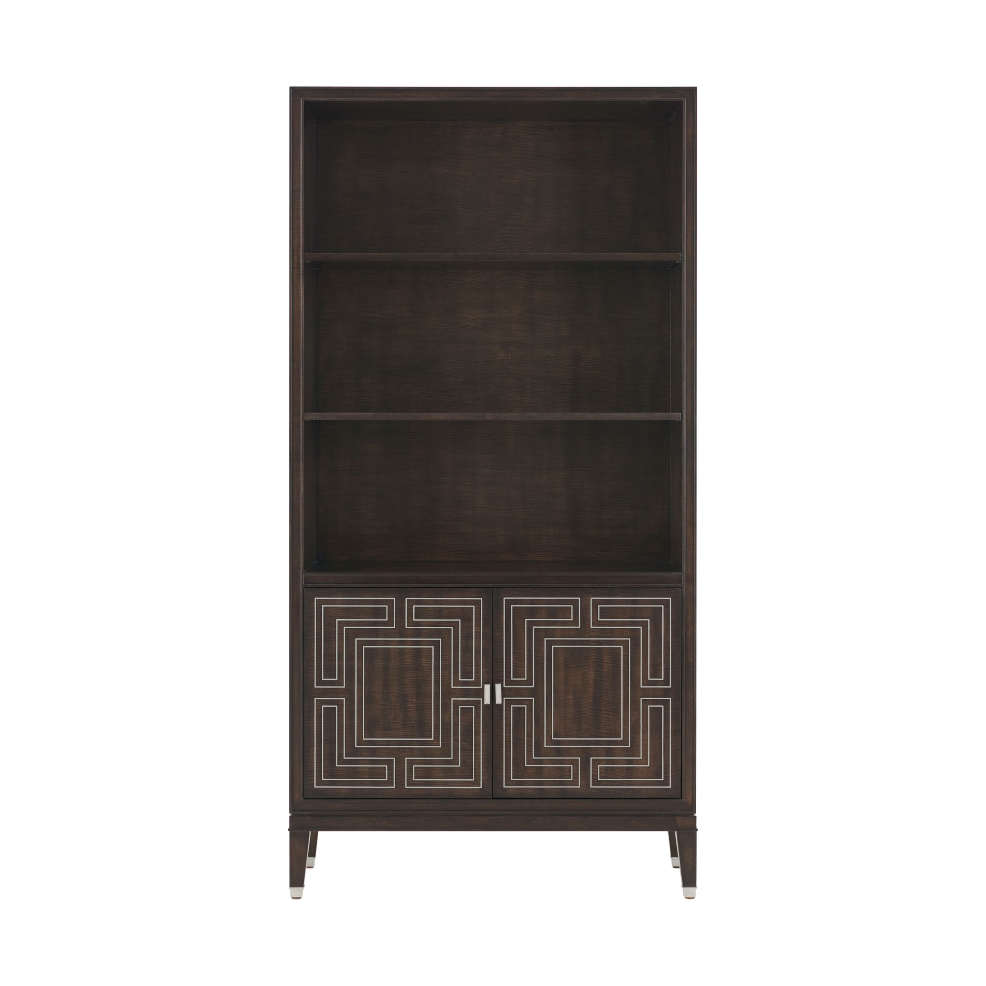 Designed for both beauty and functionality, it features three spacious shelves for displaying treasured items, while a generous lower cupboard offers concealed storage. The cupboard doors are adorned with intricate brass stringing in an elegant geometric pattern, complemented by sophisticated brass handles that enhance its luxurious charm.