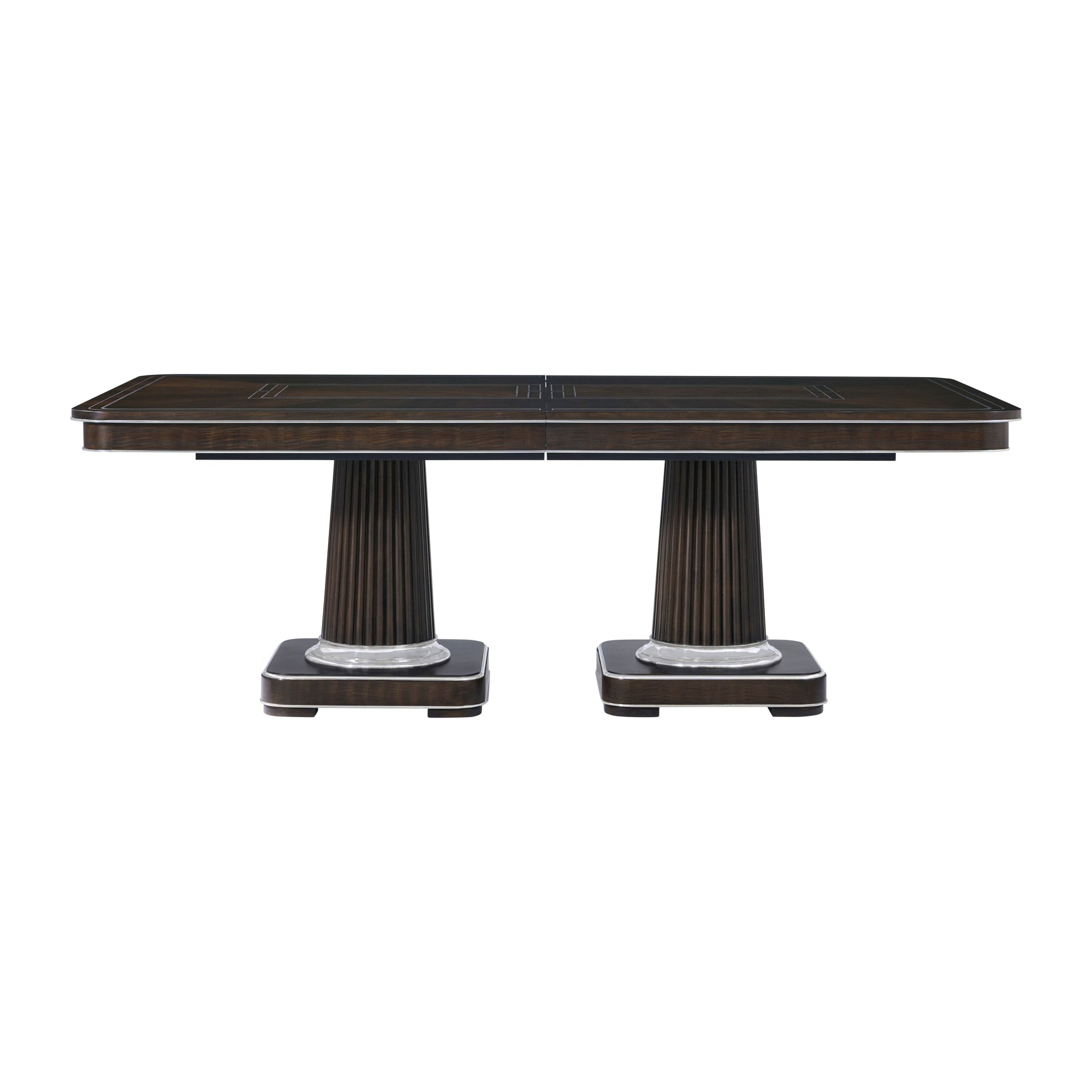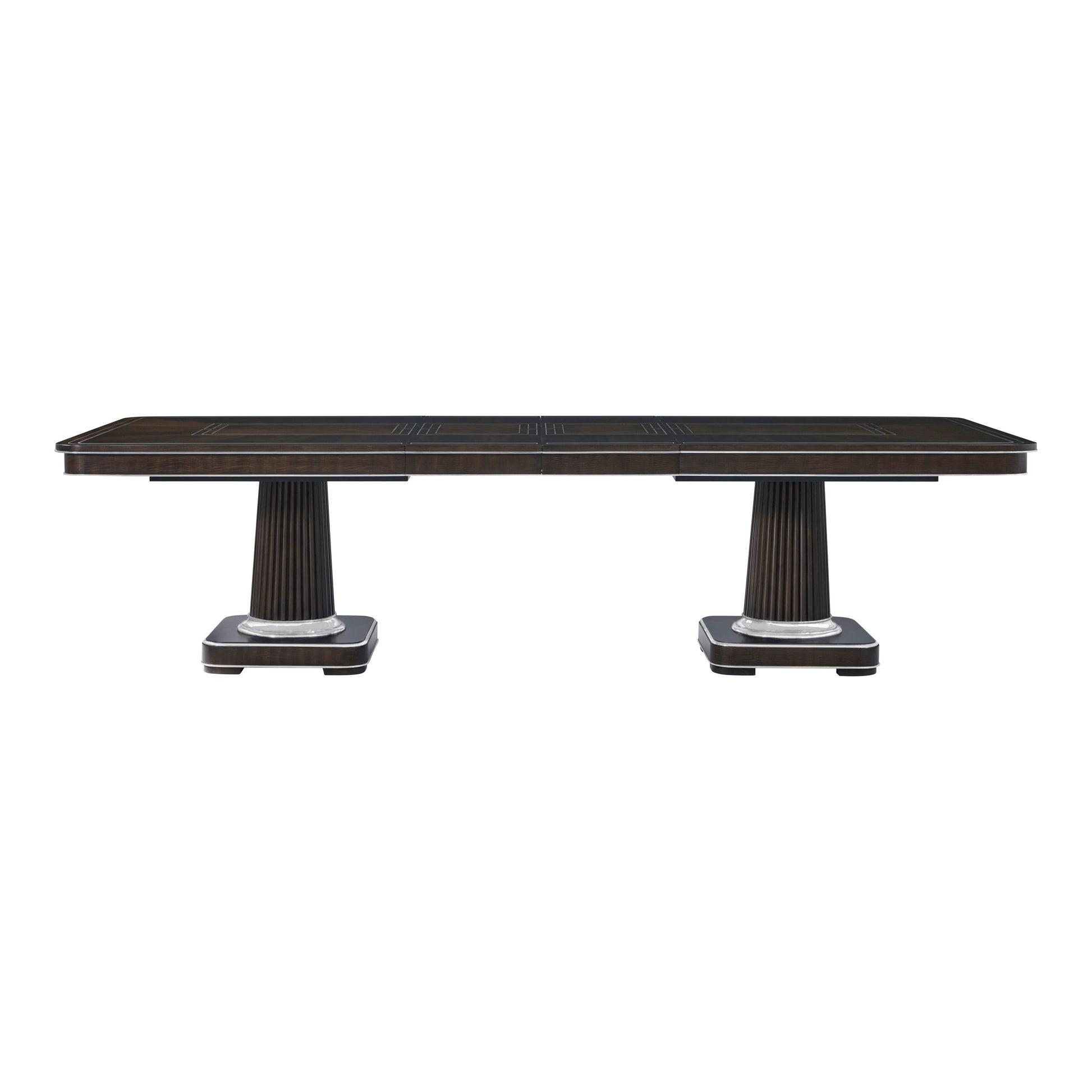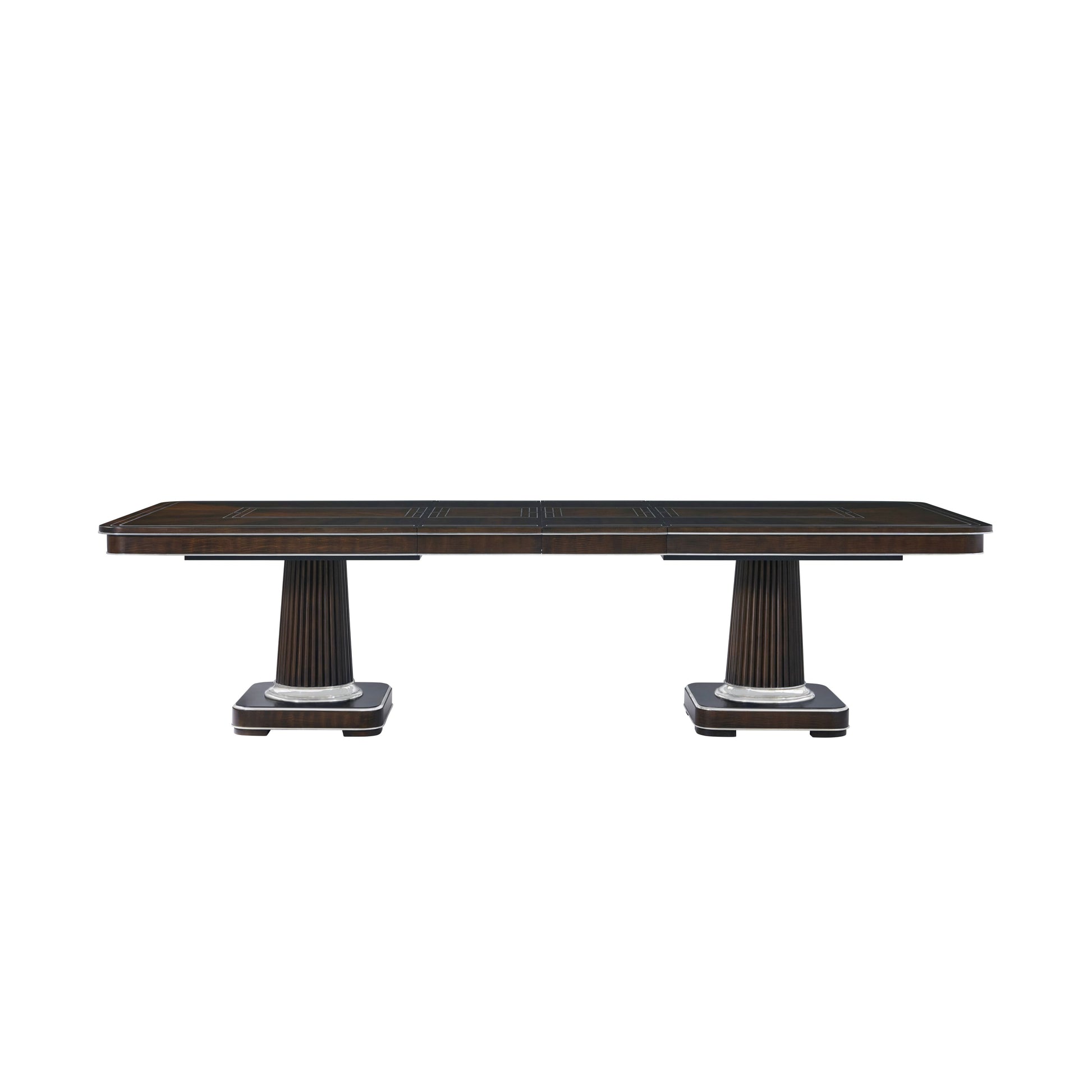 Standing gracefully on two fluted column pedestals accented with sleek chrome banding. The tabletop is adorned with contemporary geometric stringing, adding a distinctive touch of artistry and craftsmanship.