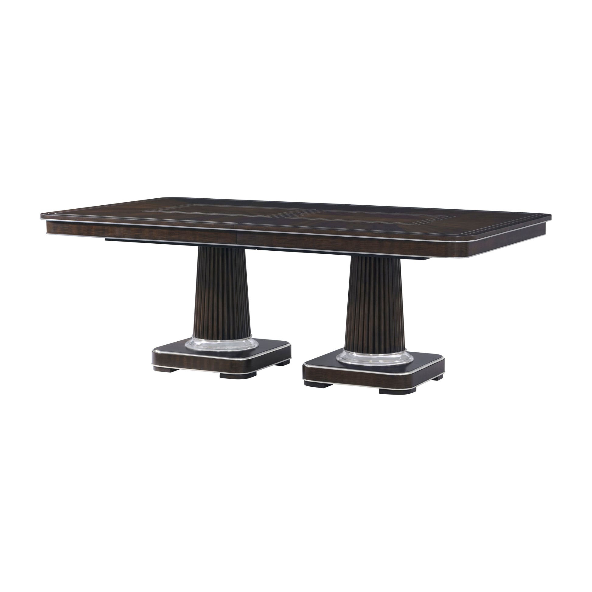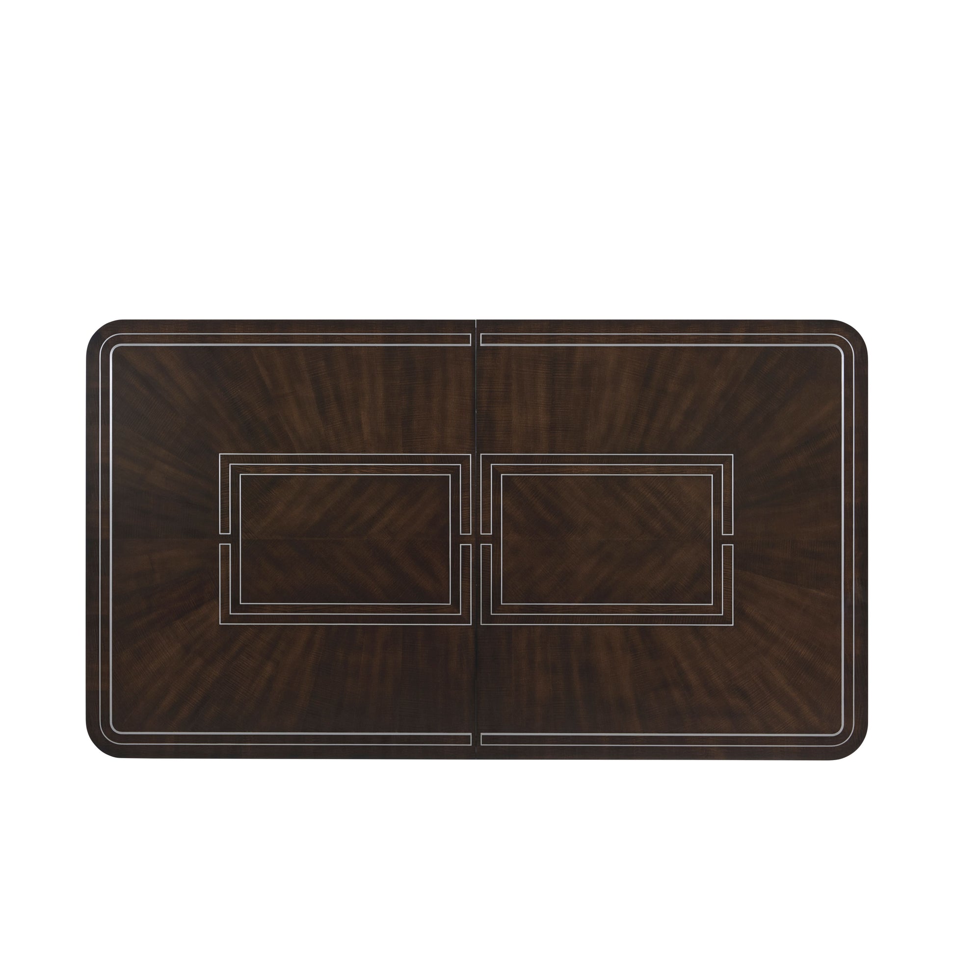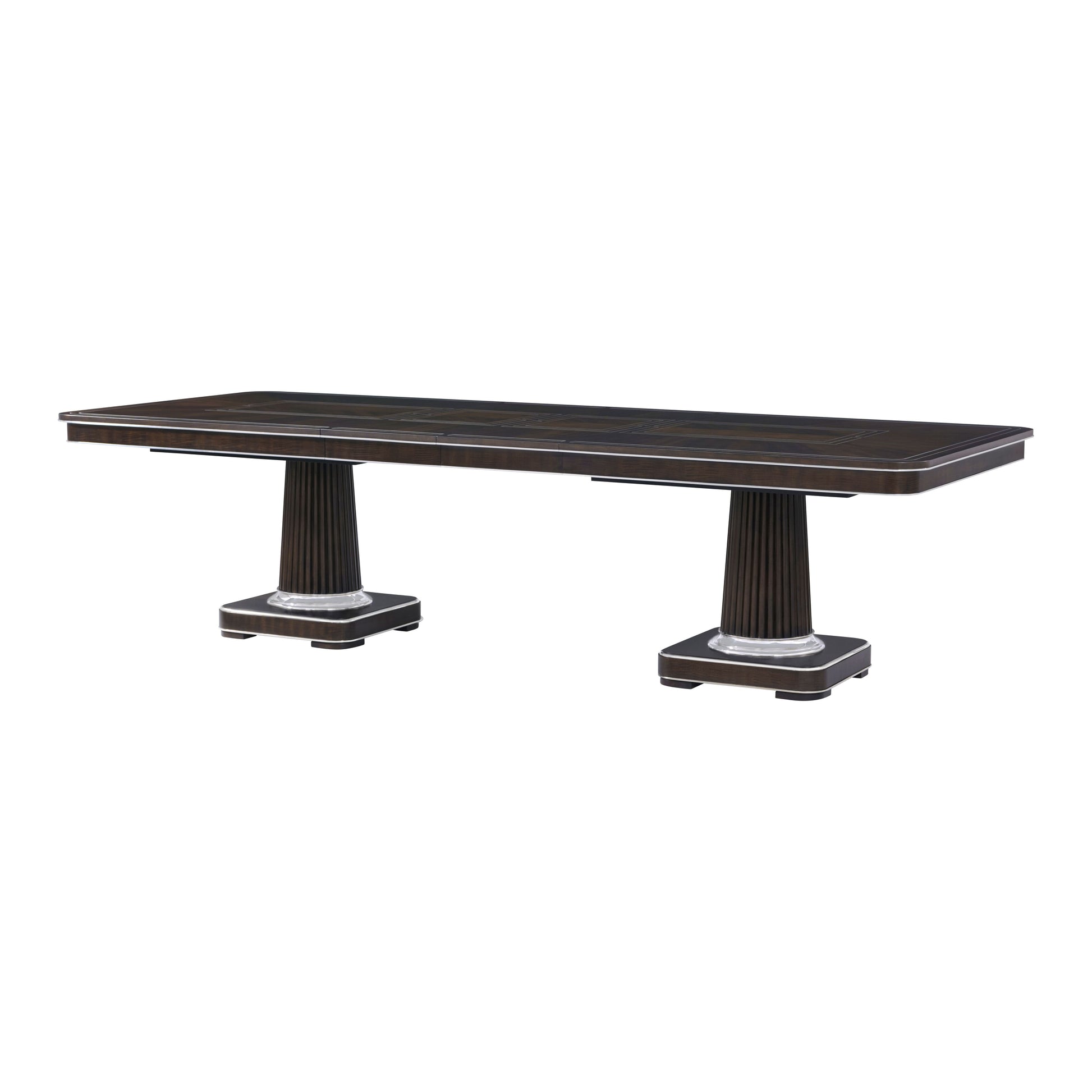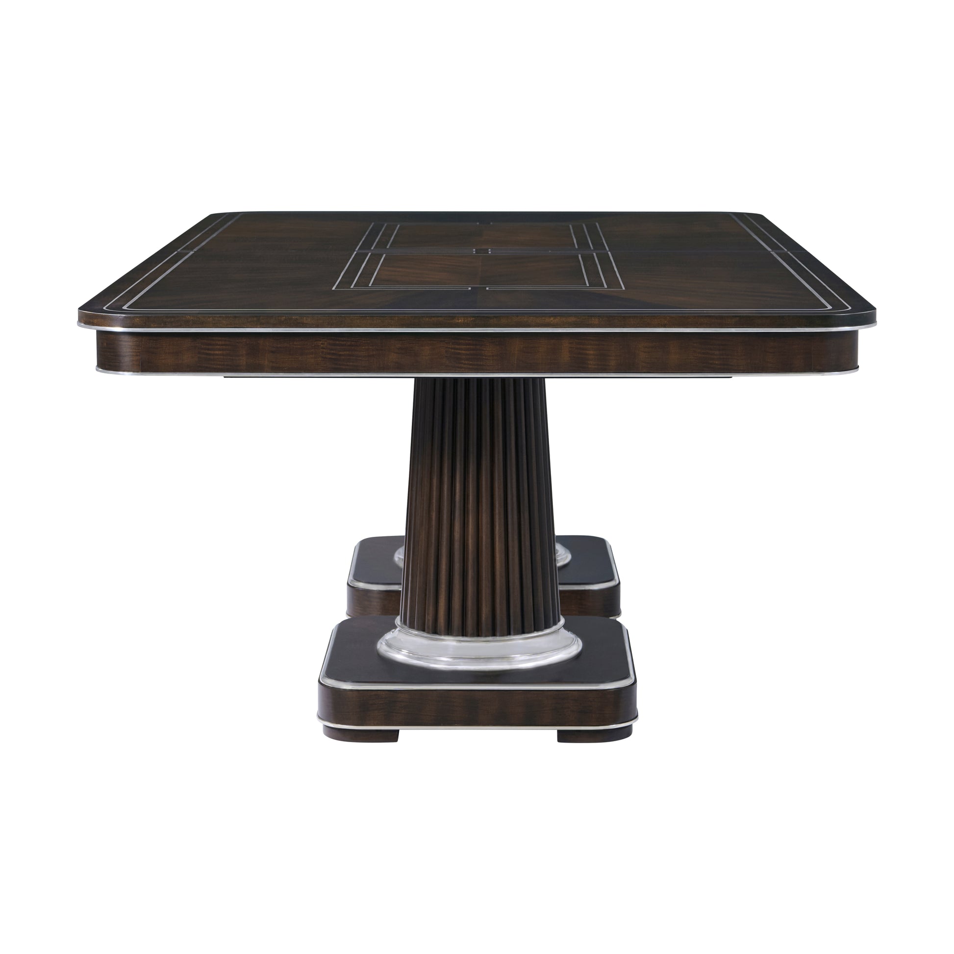 Standing gracefully on two fluted column pedestals accented with sleek chrome banding. The tabletop is adorned with contemporary geometric stringing, adding a distinctive touch of artistry and craftsmanship.