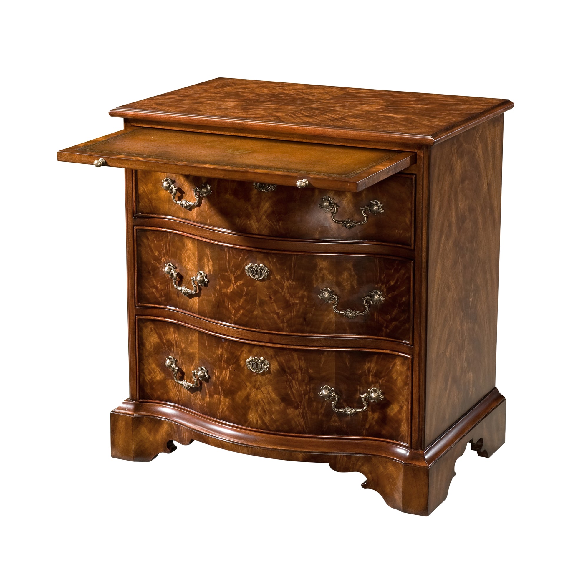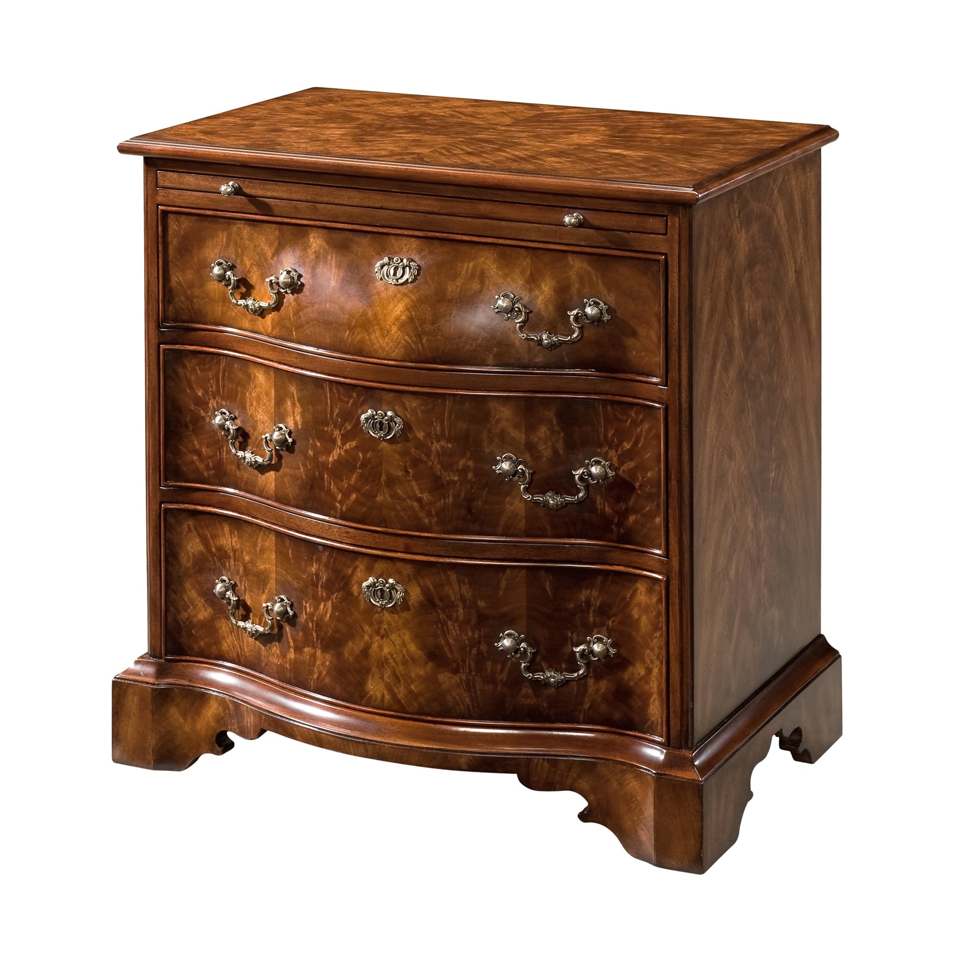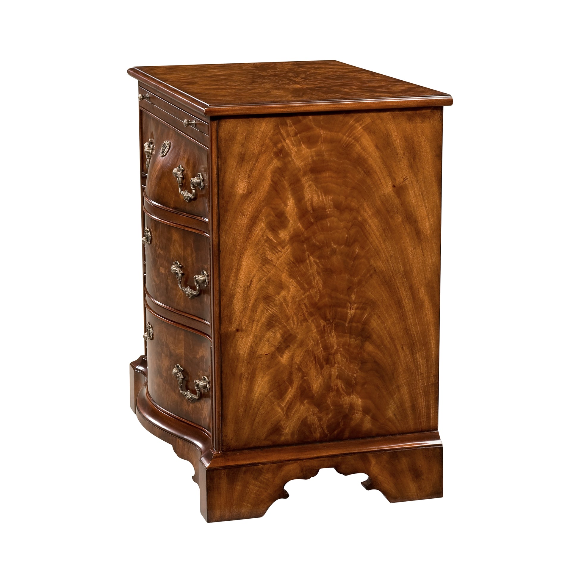 A mahogany bombé bedside chest of drawers from the Althorp Living History Collection, inspired by original George III designs, circa 1770, and crafted in the manner of Thomas Chippendale. This elegant piece features a molded rectangular top above a traditional brushing slide, offering both aesthetic charm and practical use.