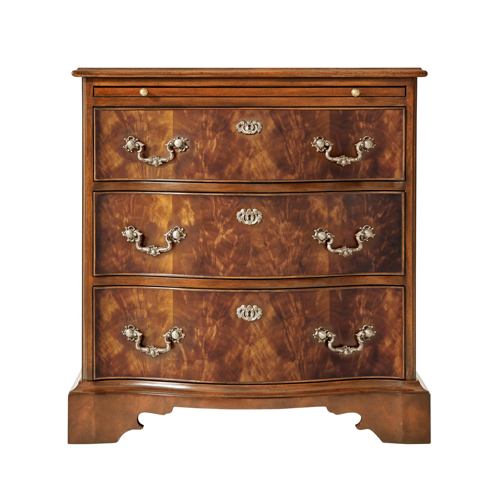 Beneath are three shaped, serpentine-fronted drawers, graduated in size and adorned with finely cast brass escutcheons and classic drop handles—hallmarks of refined 18th-century craftsmanship. The chest rests on a sturdy plinth base with ogee bracket feet, adding to its graceful silhouette and period character.