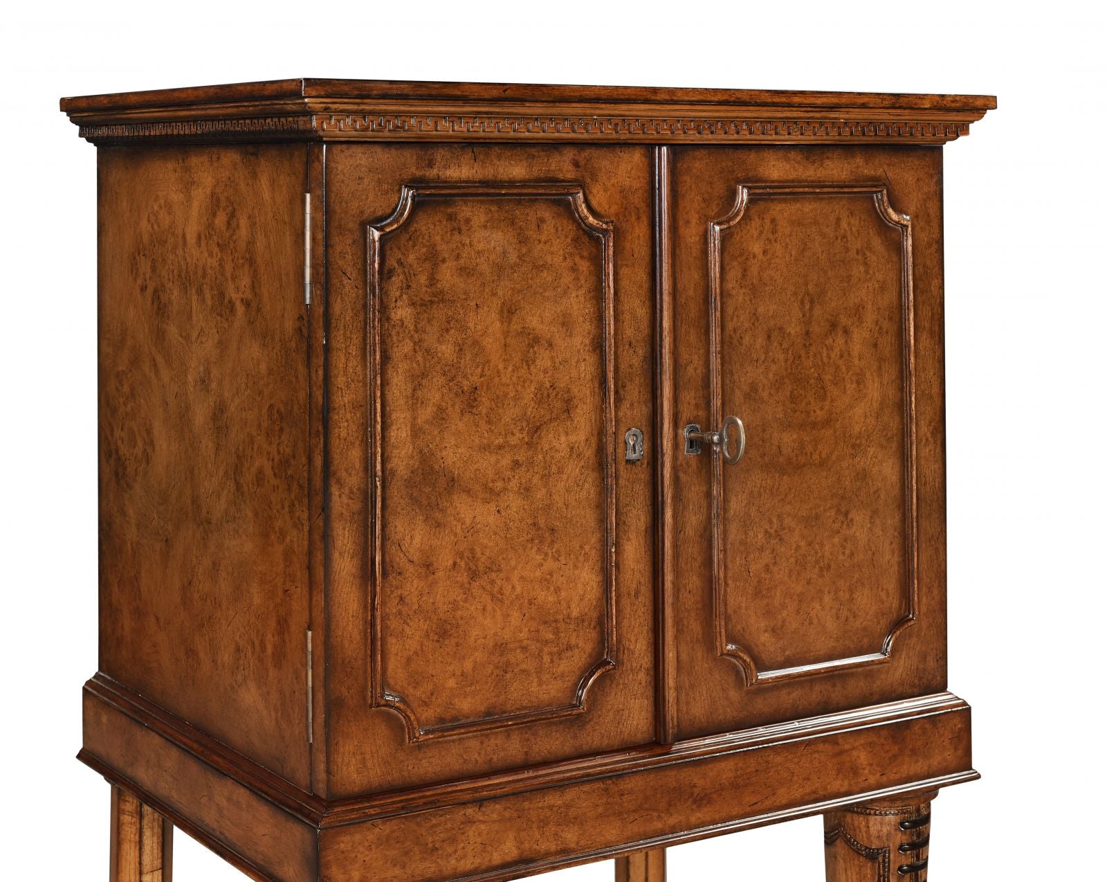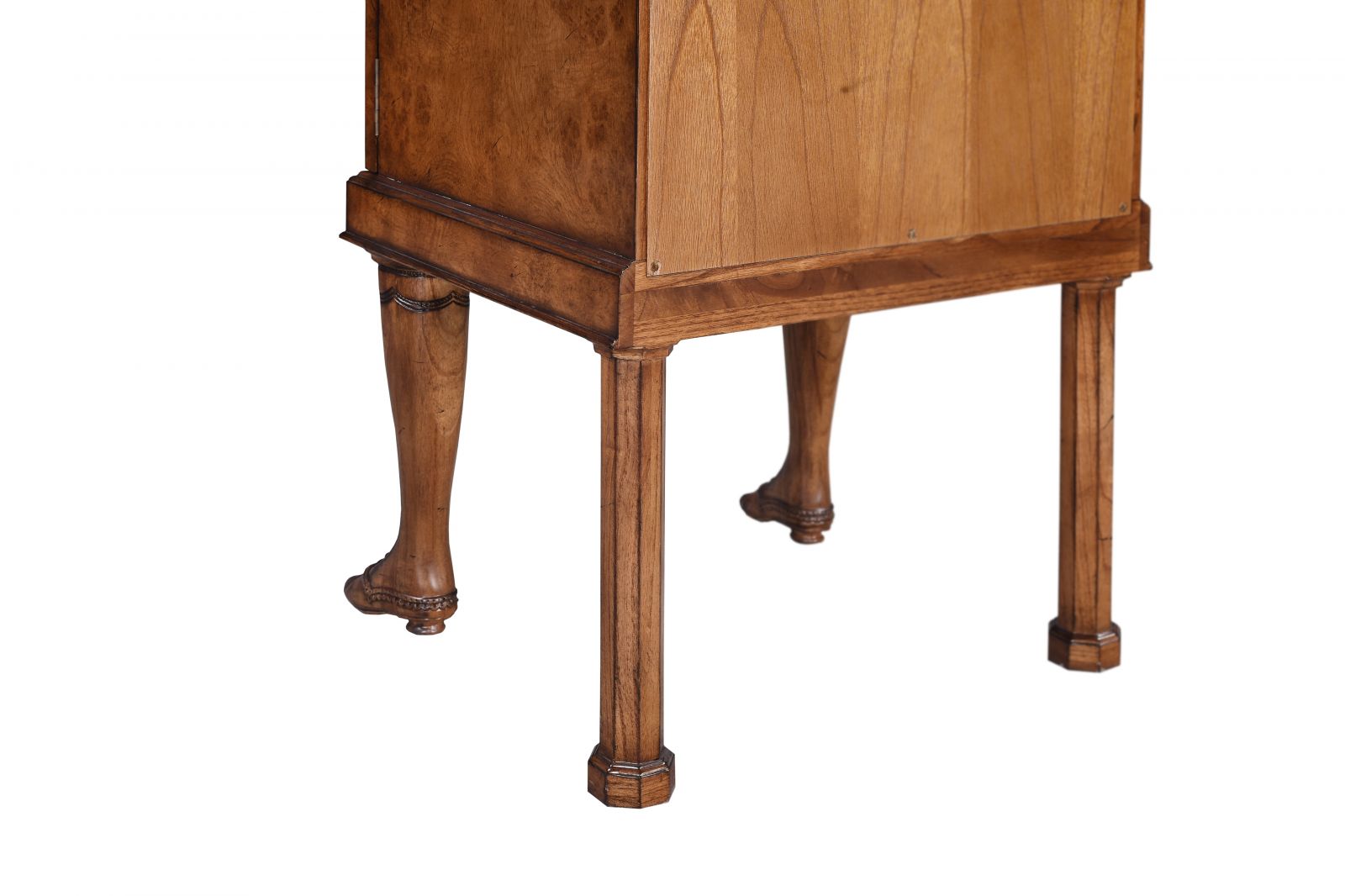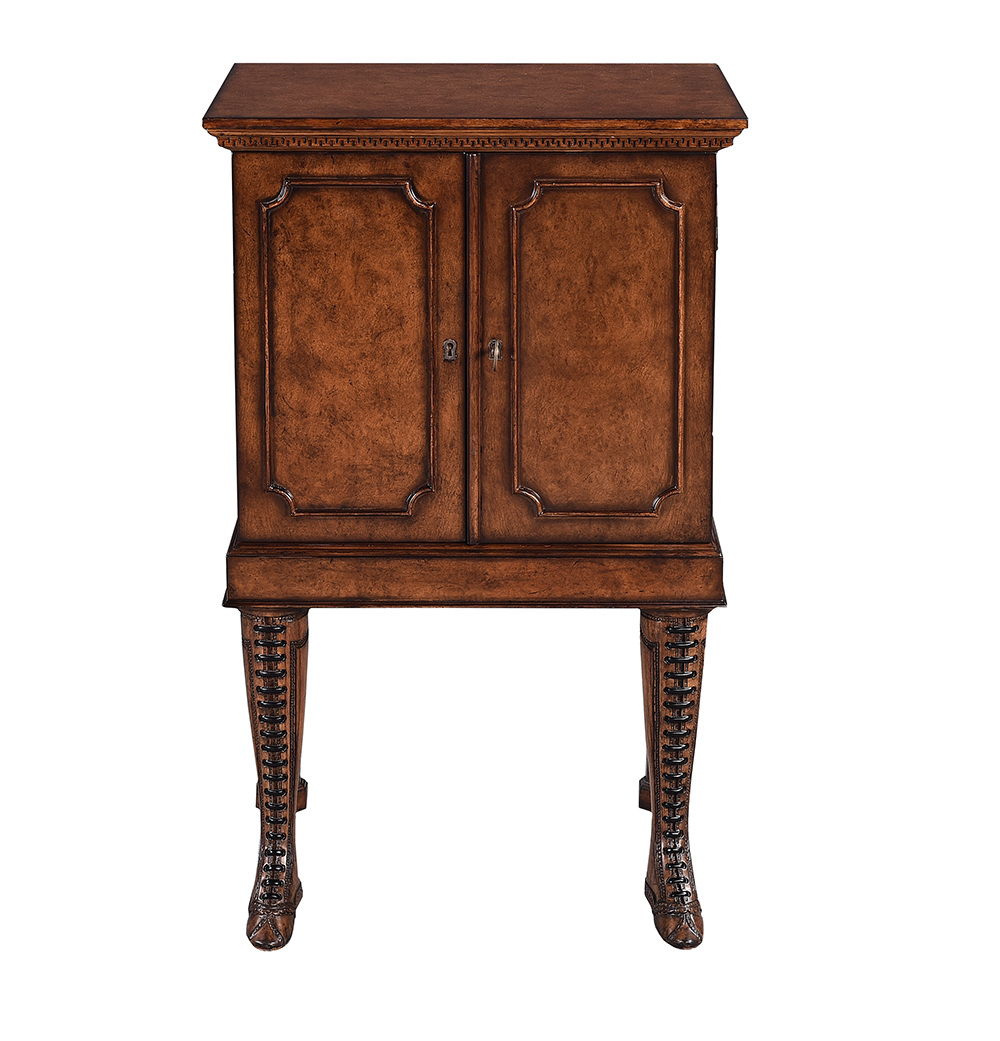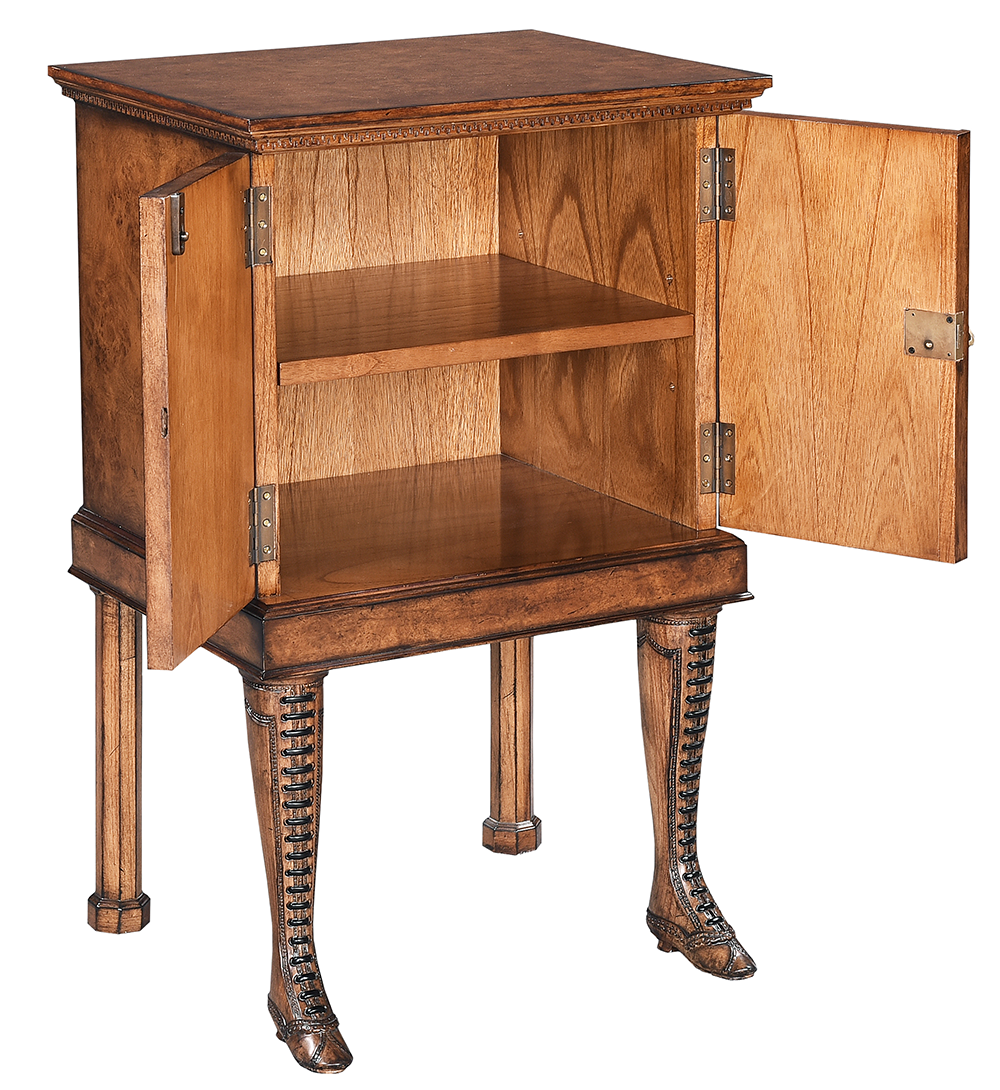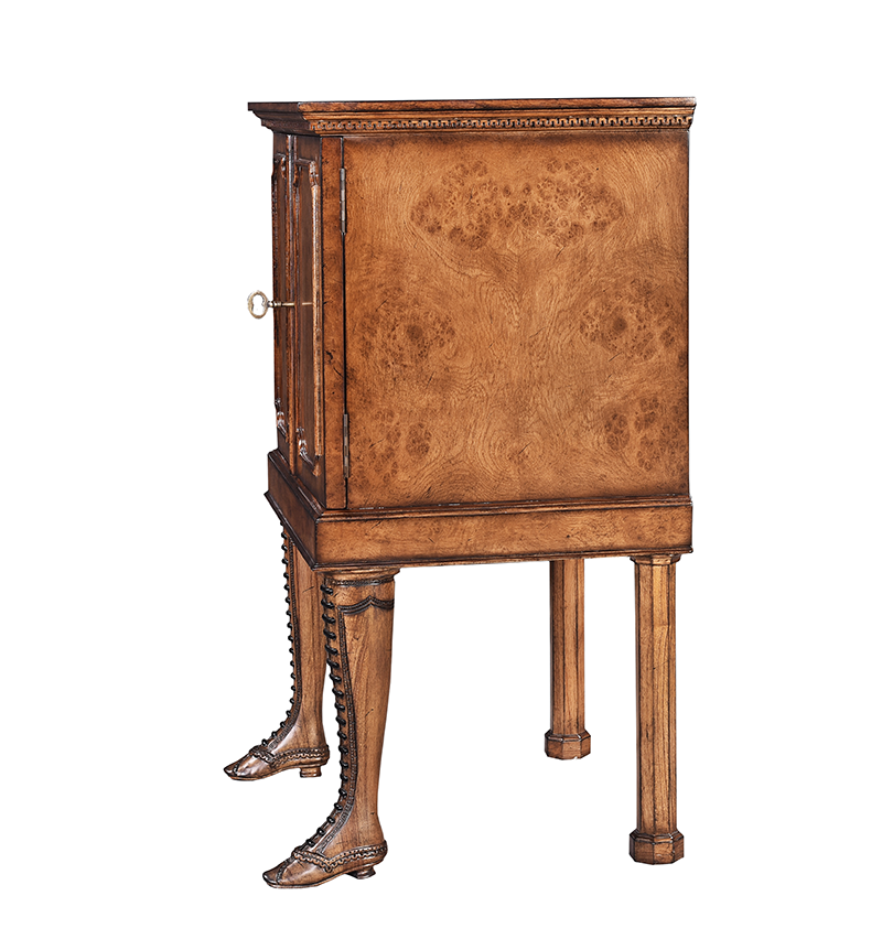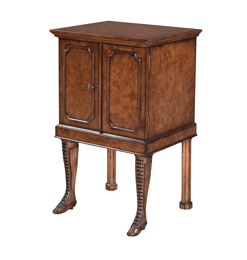 This striking mahogany chest is supported by hand-carved boots, a unique and visually captivating design feature.