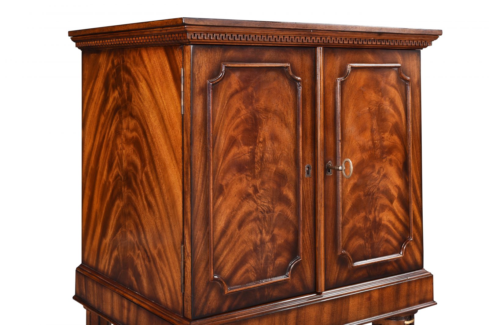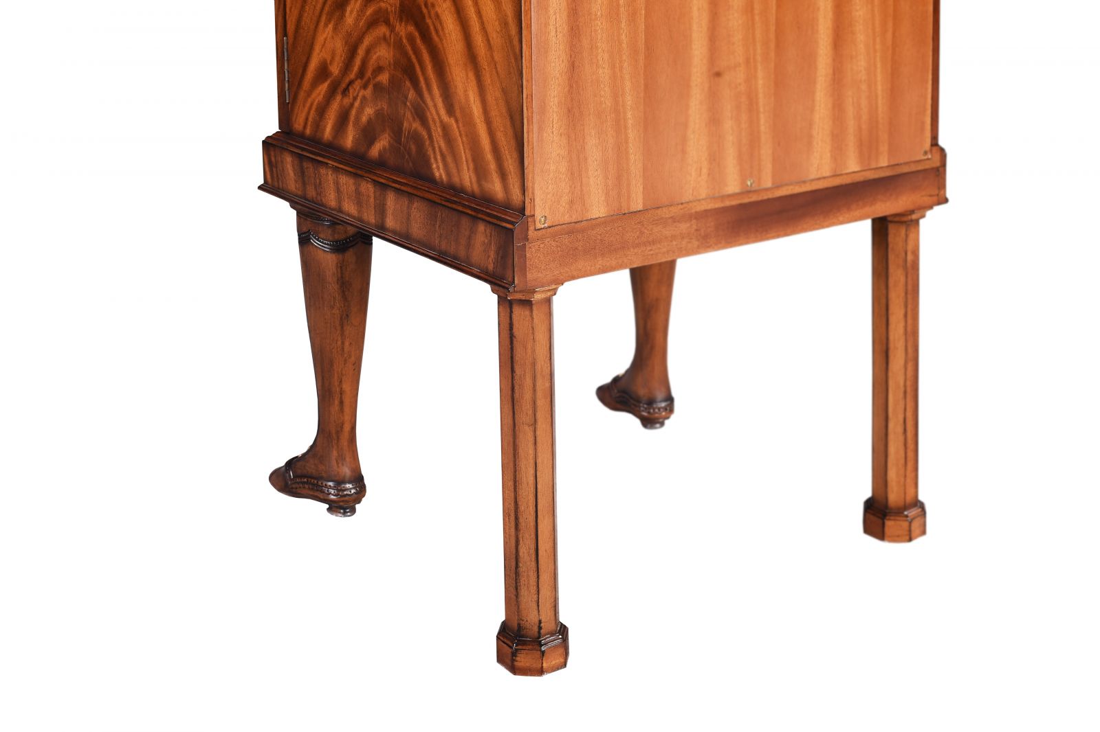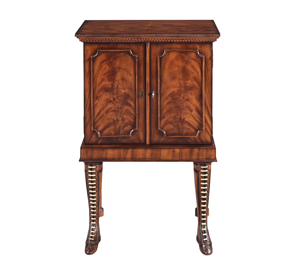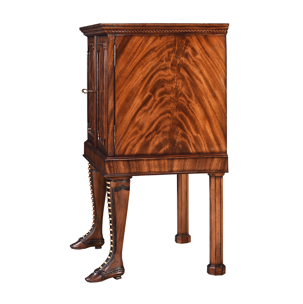 This striking mahogany chest is supported by hand-carved boots, a unique and visually captivating design feature.