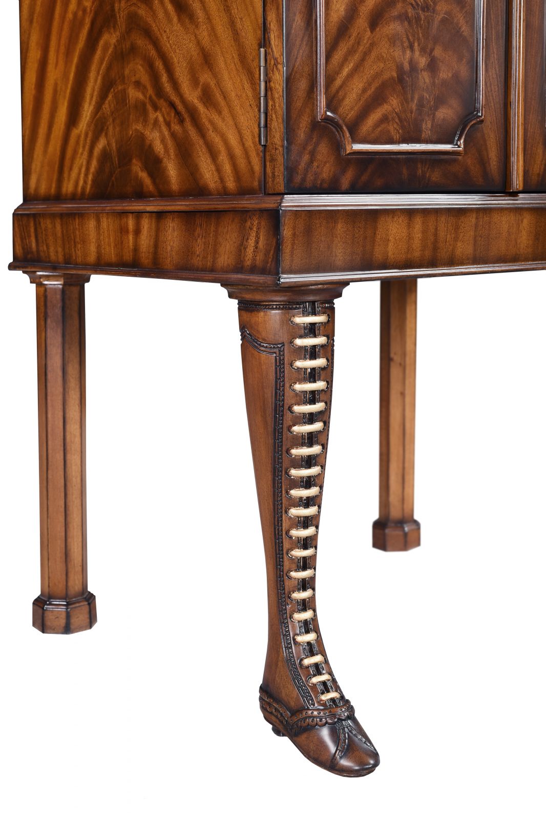 Supported by hand-carved boots, with the carved laces highlighted in gold to emphasize the detailed workmanship. The sturdy mahogany body contrasts with the intricately carved boot legs, creating a unique design.