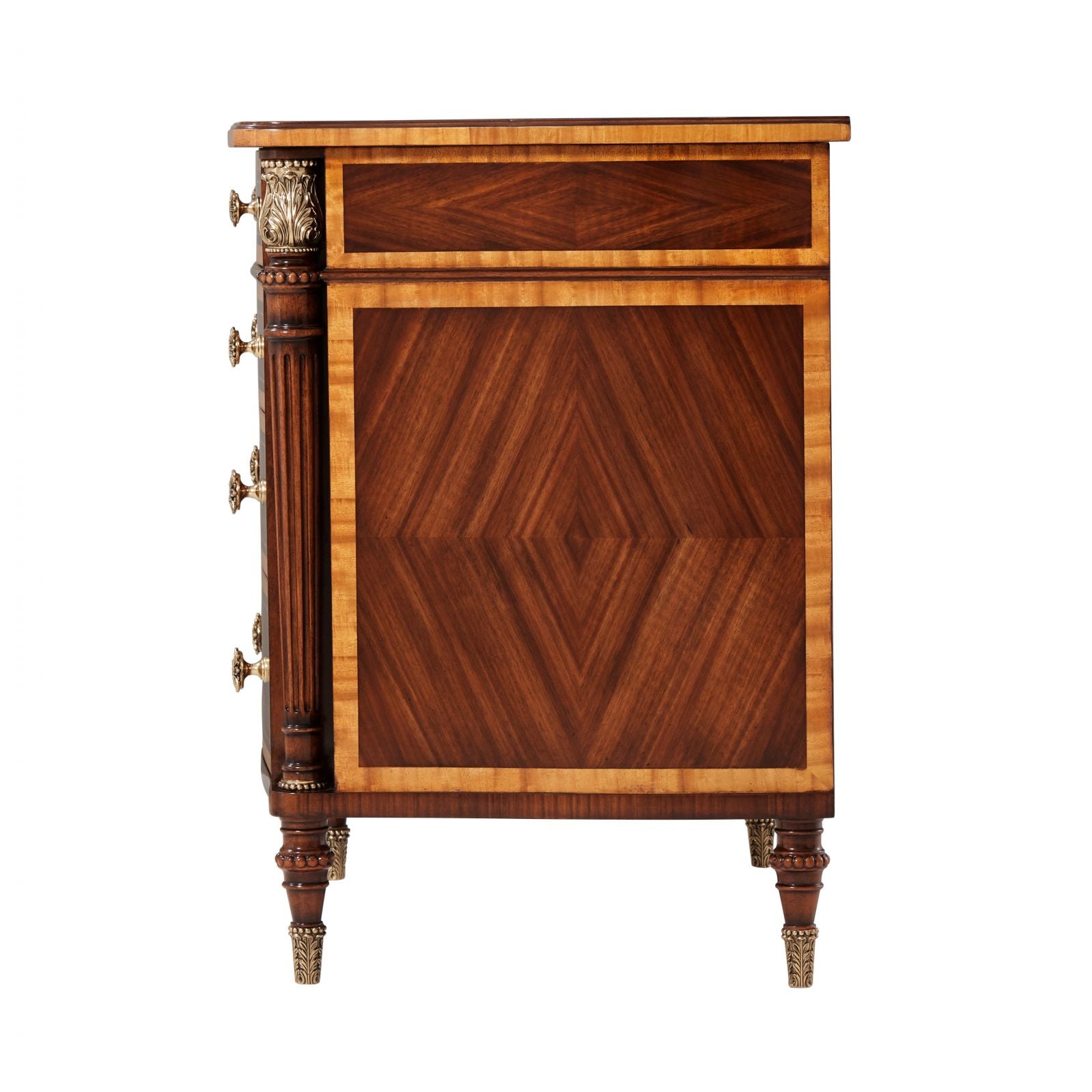 This piece reflects traditional woodworking techniques, combining solid mahogany with decorative veneers and brass detailing to achieve both functionality and refined aesthetic appeal.