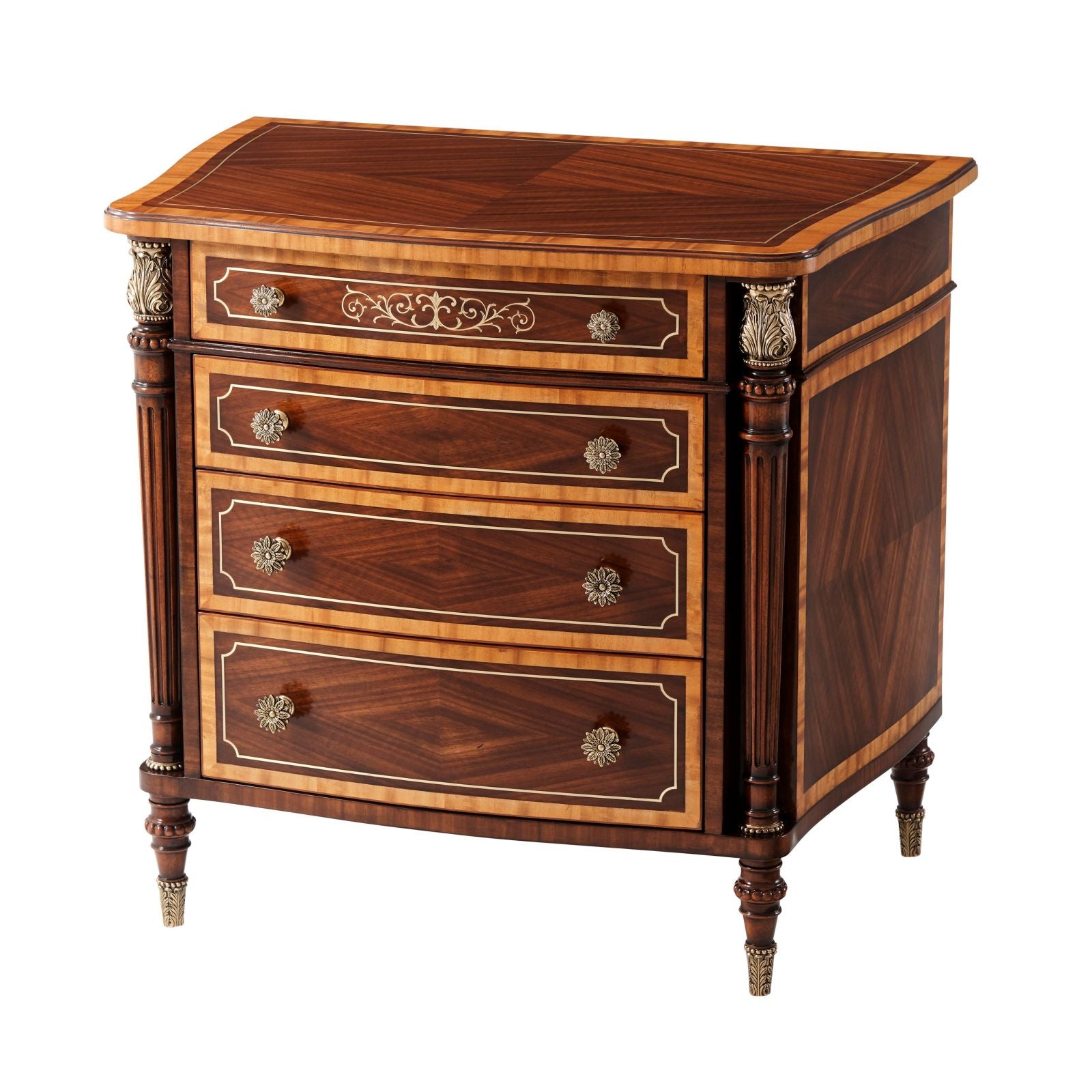 The nightstand includes three drawers, each fitted with finely cast brass handles. Floral and line brass inlays are delicately incorporated into the design, adding an additional level of craftsmanship. The serpentine shape not only enhances the overall structure but also provides a smooth and flowing appearance.