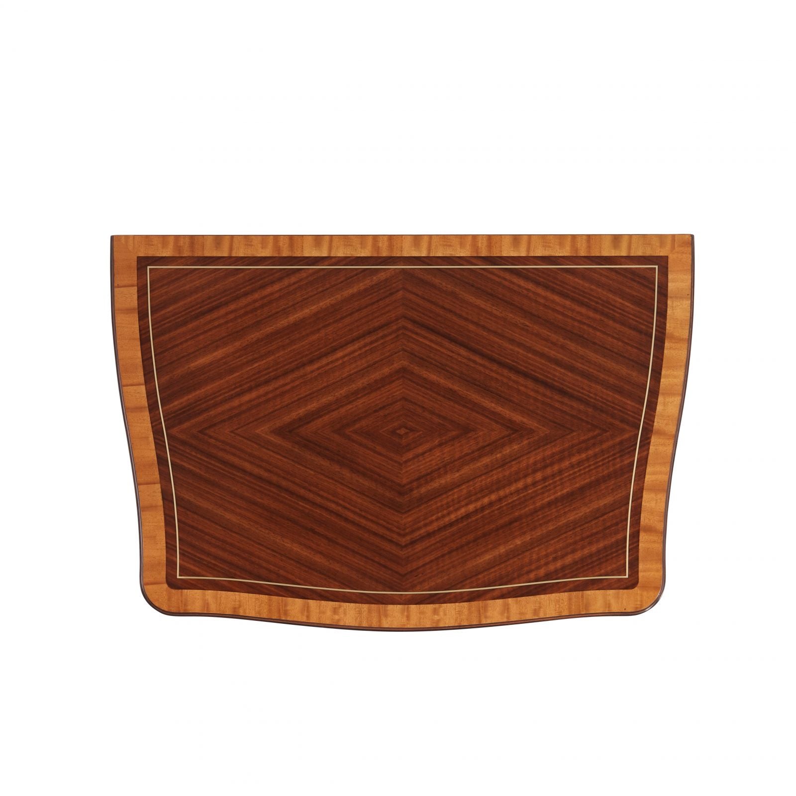 A serpentine nightstand crafted from solid mahogany, featuring highly figured etimoe veneers that highlight the natural patterns of the wood. The edges are finished with movingue veneer crossbanding, creating a defined contrast that accentuates the curved profile of the piece.
