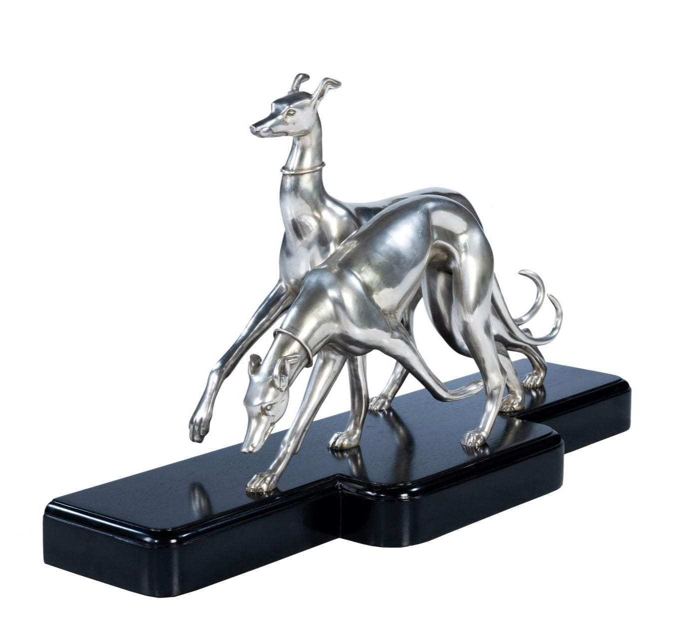 This elegant sculpture, depicting a pair of whippets, is expertly crafted in polished brass with a silver finish. The fluid lines and refined detailing capture the dogs’ poised stance, emphasizing their athletic build and noble character.