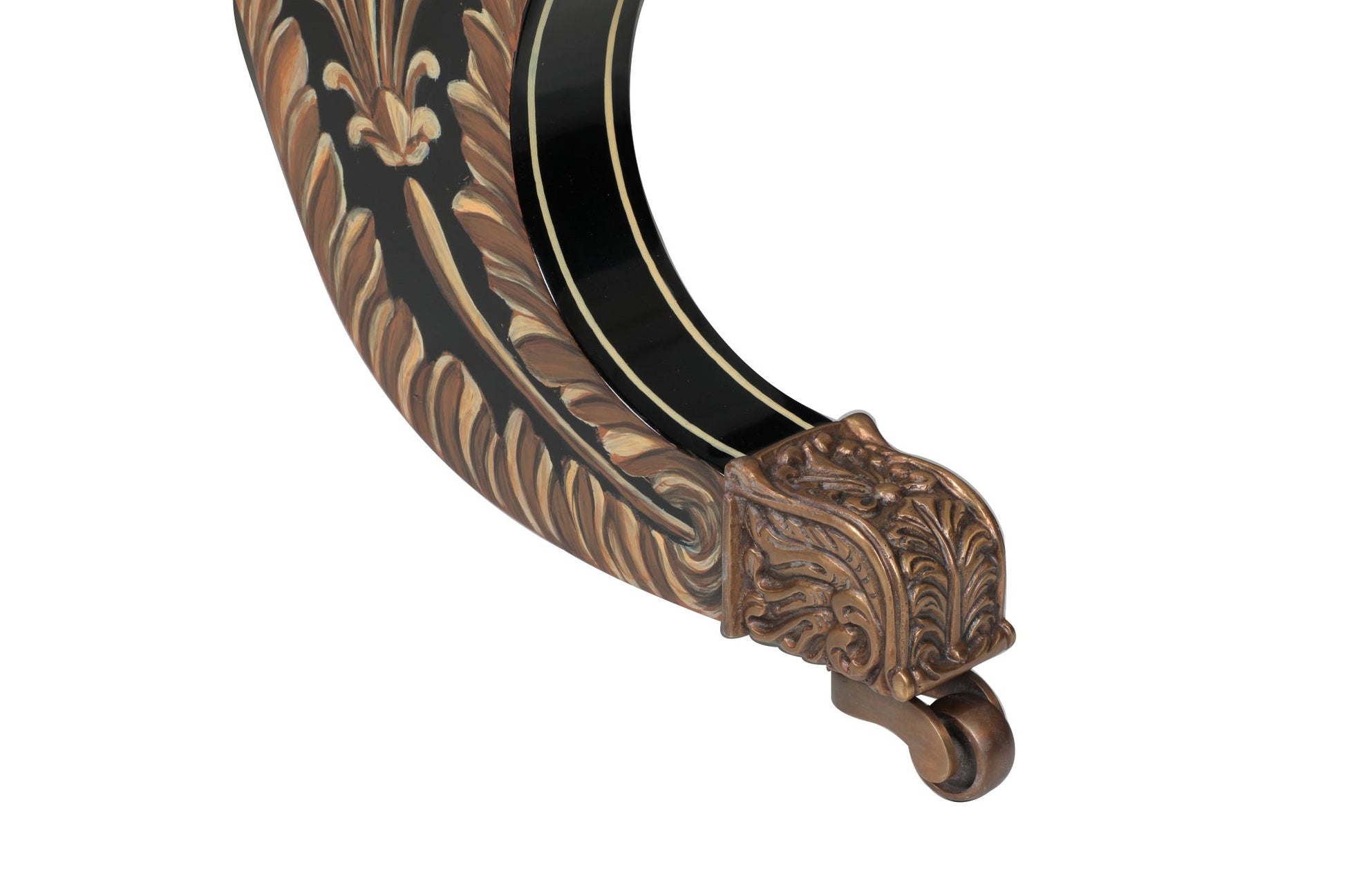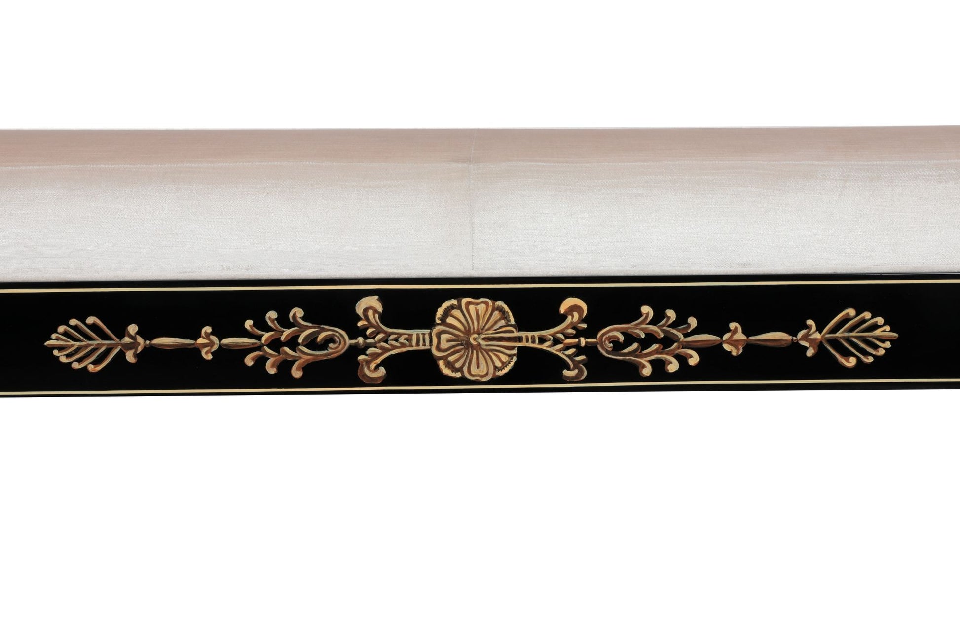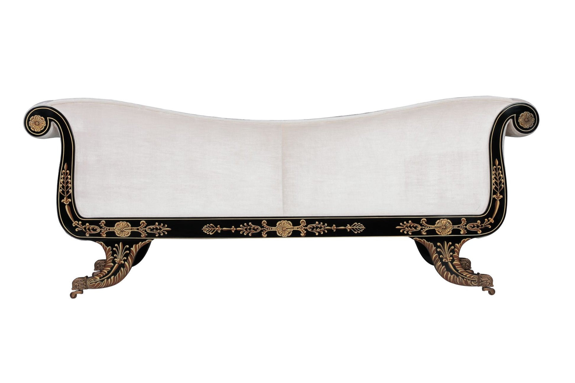 The Astana Sofa is a refined balance of comfort, craftsmanship, and timeless style. Upholstered in a sumptuous fabric that invites relaxation, it rests upon a sleek black lacquered frame, exquisitely hand-painted with delicate gold floral motifs. This striking detail lends an air of elegance and artistry, making the sofa as much a statement piece as it is a place to unwind.