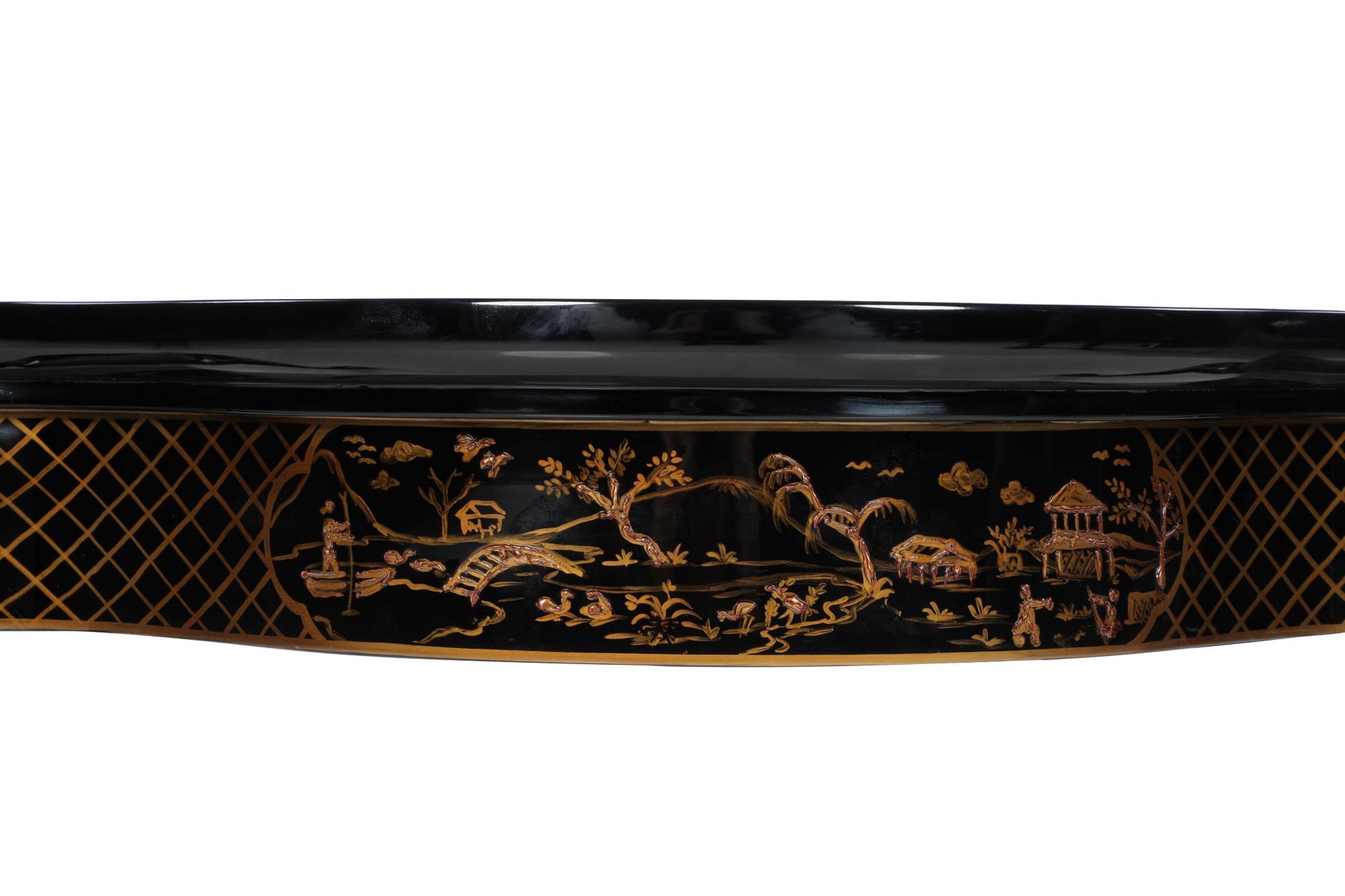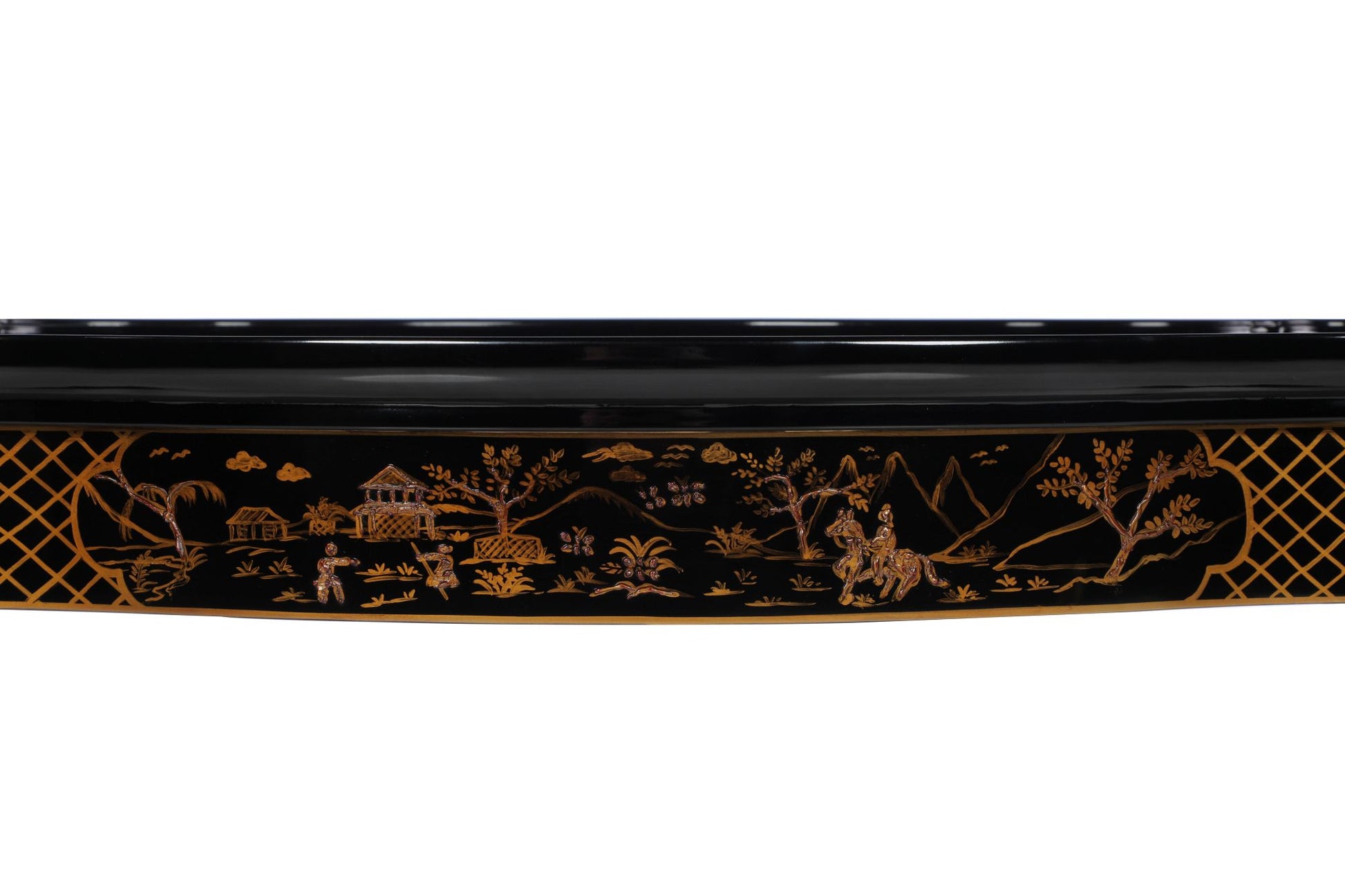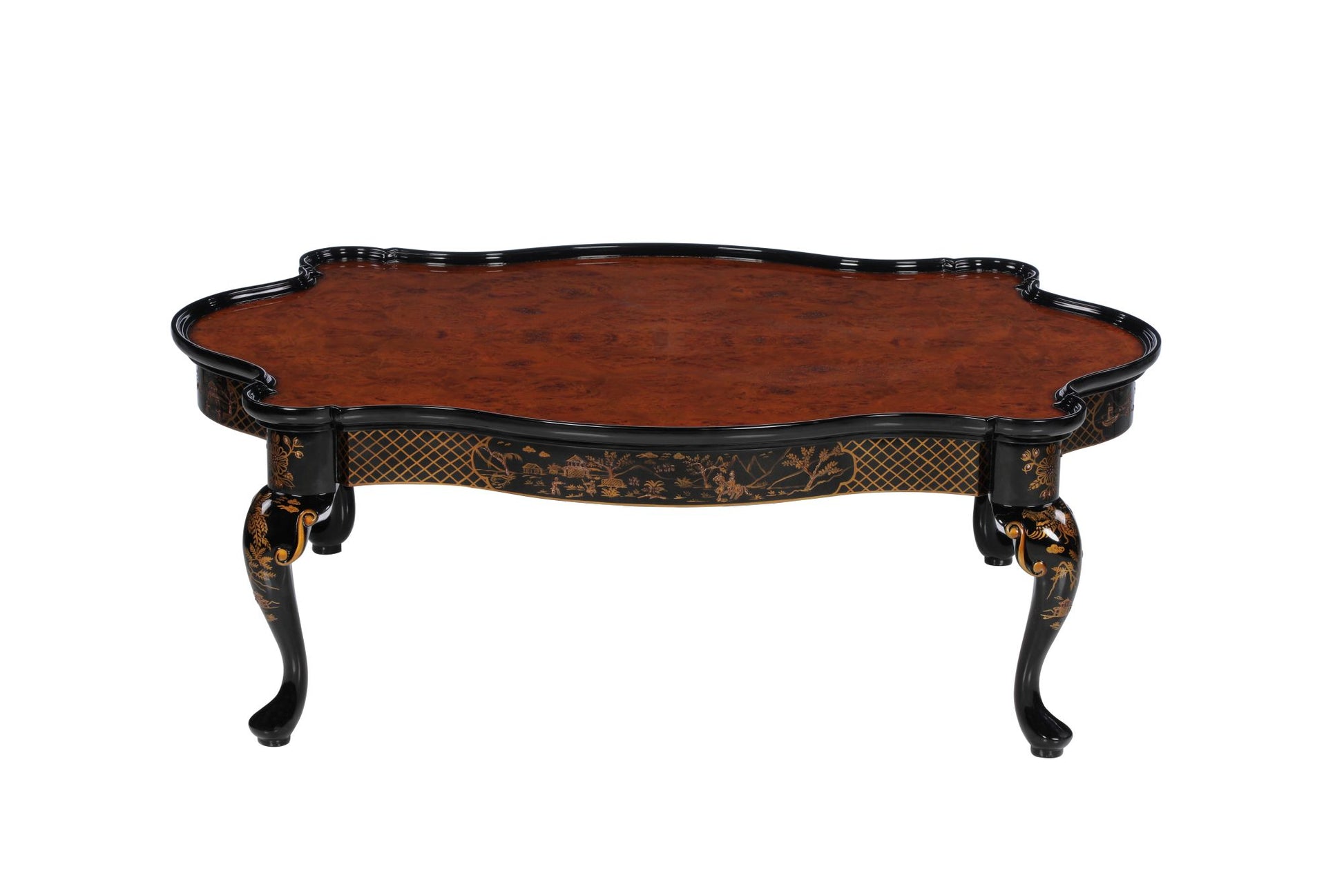 This elegant coffee table is crafted with a solid mahogany frame and a sumptuous burl-veneered top, combining durability with refined beauty. The ebony-finished frame is adorned with delicately hand-painted Chinoiserie scenes, inspired by the artistic traditions of the 17th and 18th centuries, while each leg features a meticulously painted phoenix, adding a touch of symbolic elegance.