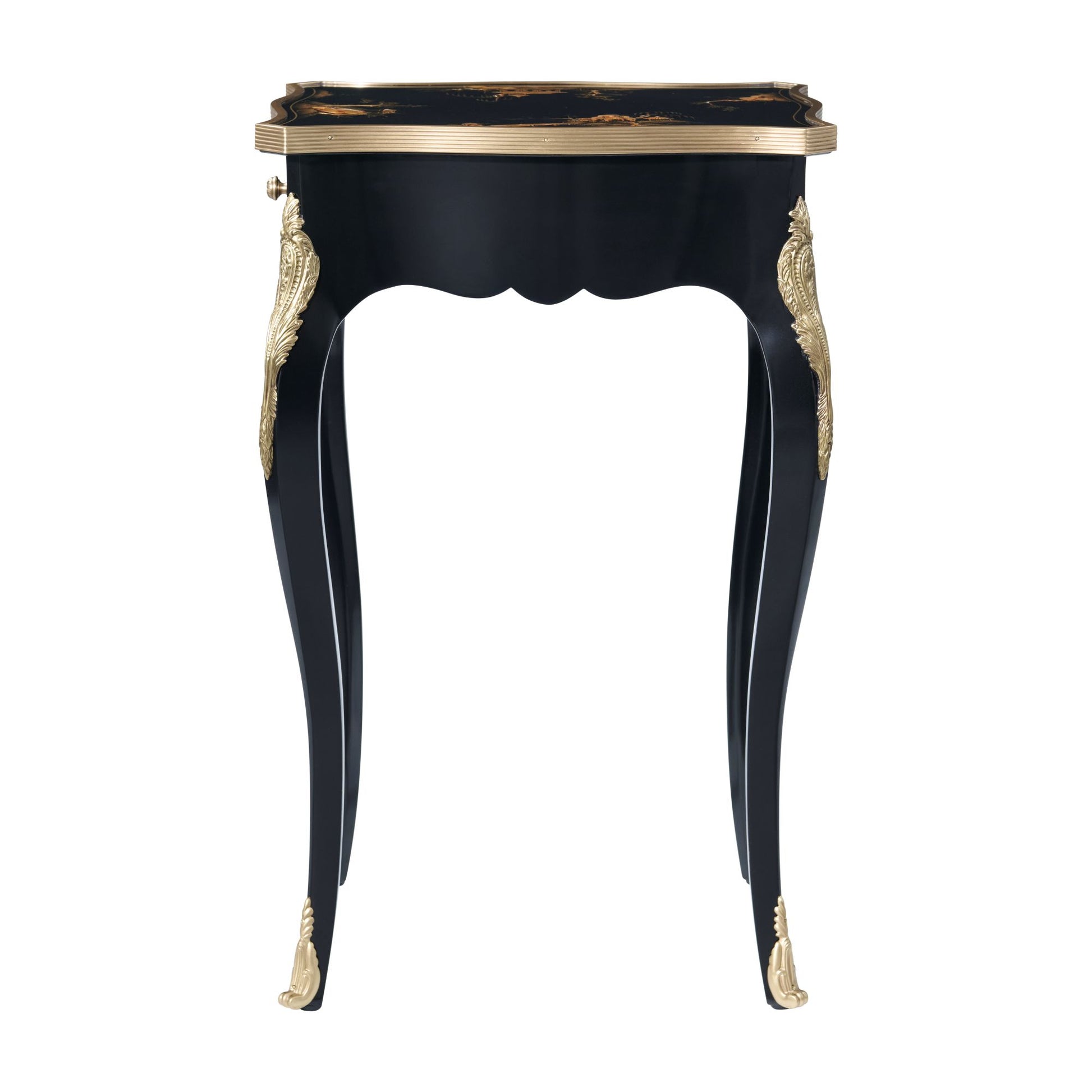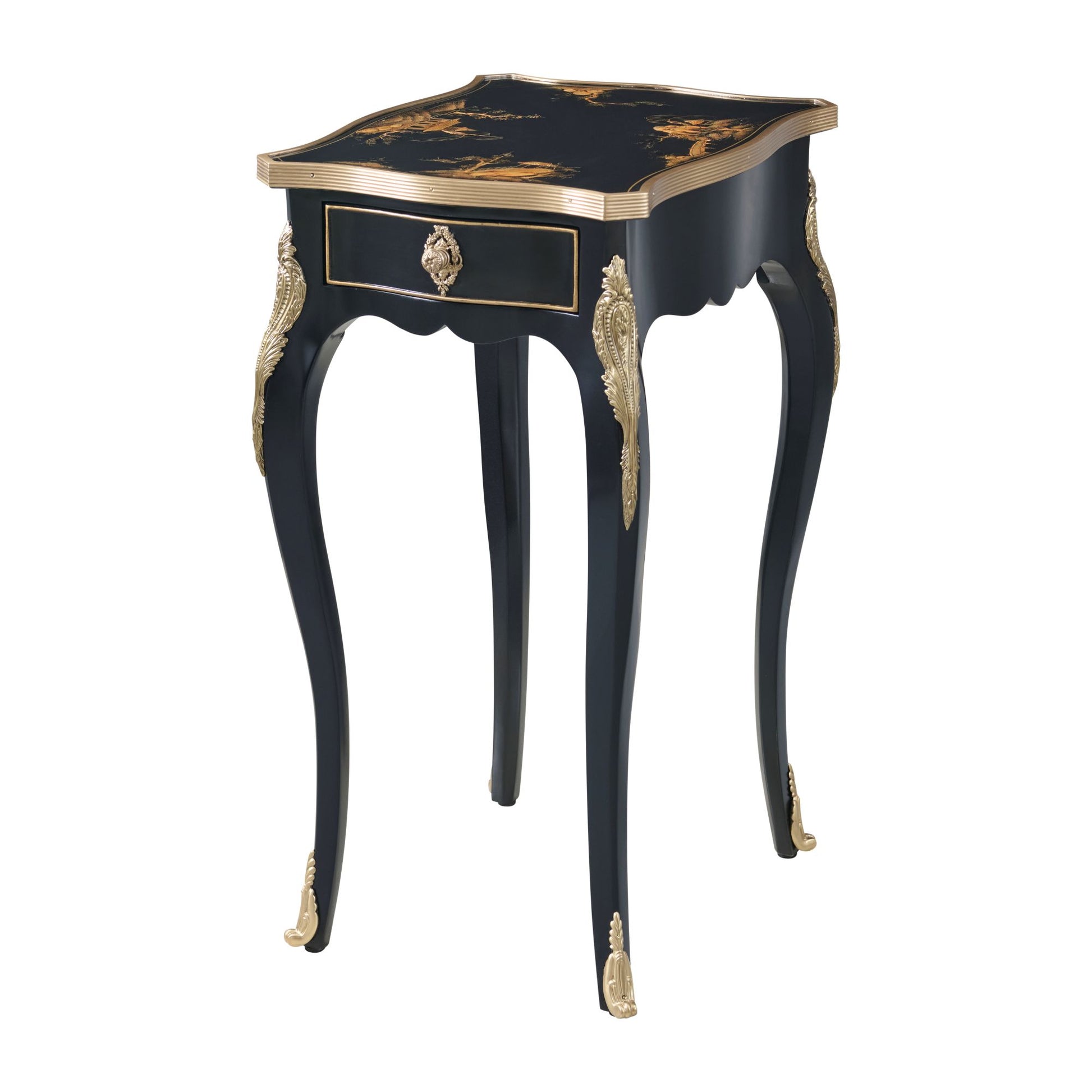 The Chinoiserie Tranquillity Accent Table brings serene elegance to any space with its hand-adorned chinoiserie tabletop and protective glass overlay. A single pull-out drawer, gracefully curved legs, and steel-cast nature-inspired Indochine accent hardware combine beauty with subtle functionality.