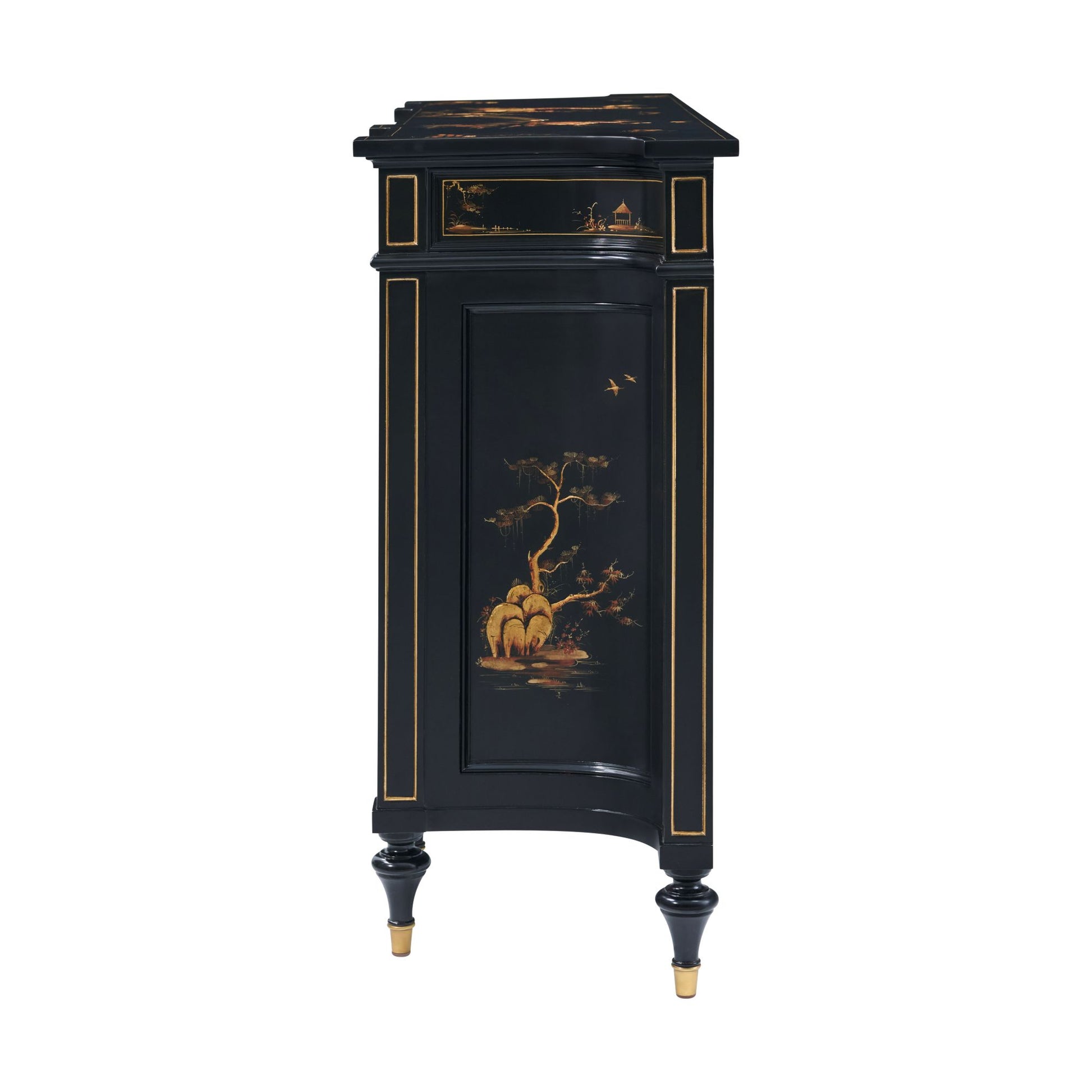 The Chinoiserie Emperor Sideboard takes inspiration from the magnificent architecture of 18th-century China, with a balanced, symmetrical form that echoes imperial design. Hand-adorned chinoiserie brushwork and gold-tone accents elevate its stately silhouette, while expertly cast hardware adds a refined, regal finish.