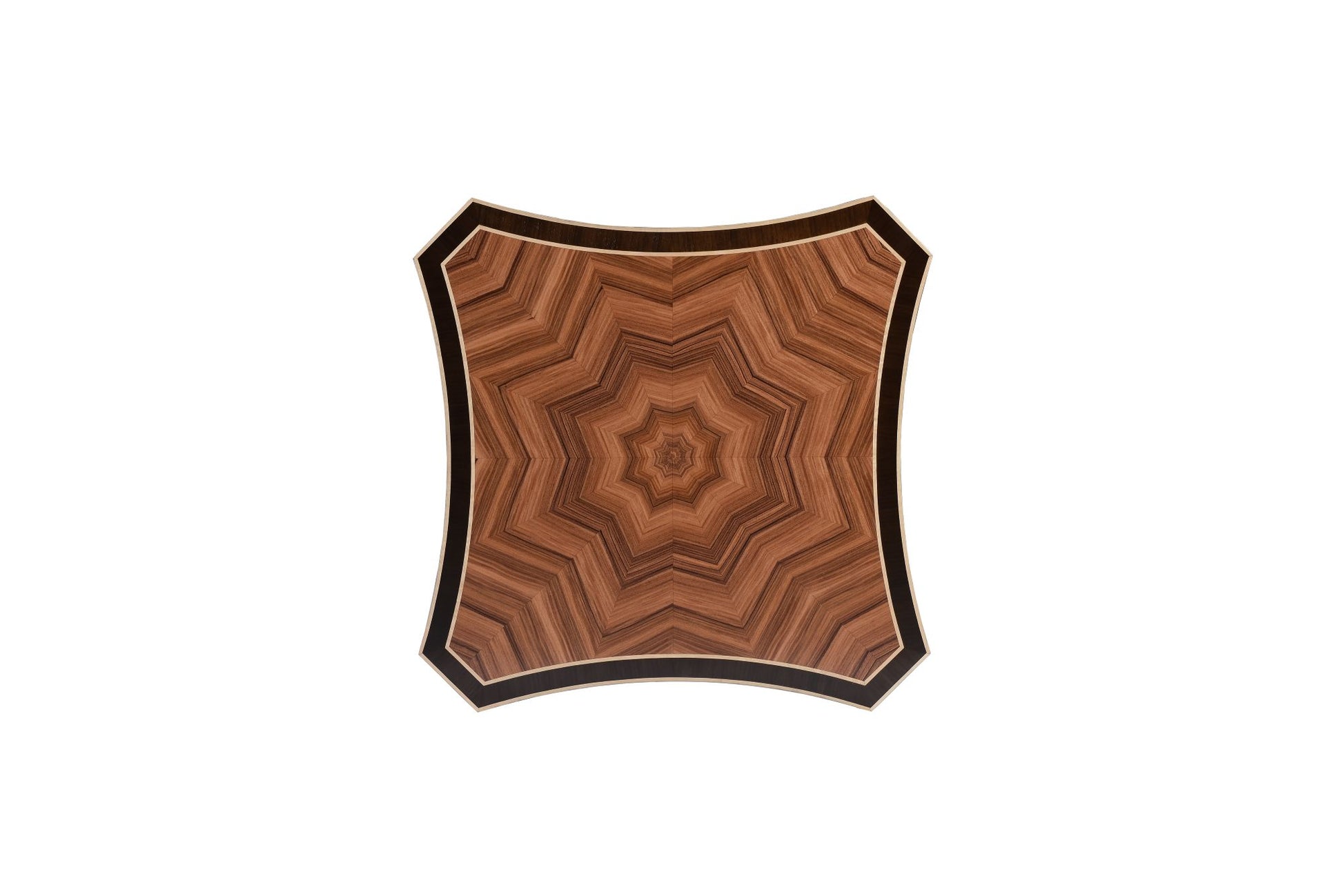 Its refined top features an intricate inlay pattern, carefully crafted from a selection of premium veneers including Santos, Maple, and Walnut. The contrasting tones and natural grains create a striking visual appeal, making the table as much a conversation piece as it is a functional surface.