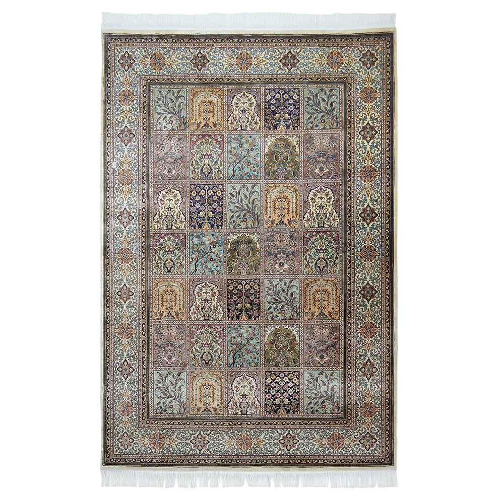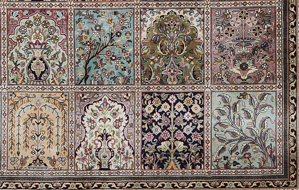 A traditional carpet after a Persian Bakhtiari design, circa 1920, with pure silk pile hand woven on a cotton warp and weft foundation to 256 knots per square inch.